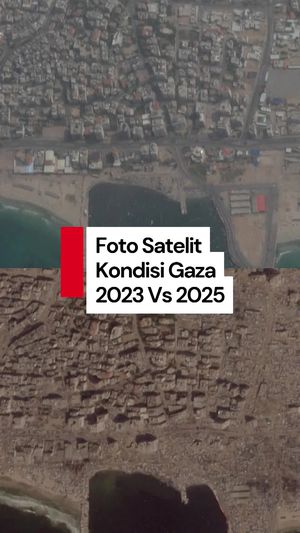 Berikut visual satelit yang memperlihatkan perbandingan situasi di Gaza pada 2023 dan Gaza pada 2025 yang hancur lebur digempur Israel.