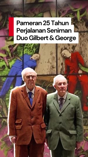 Dikenal dengan gaya eksentrik, Gilbert & George terus membuktikan bahwa usia bukan batas untuk berkarya. Kali ini mereka menampilkan karya-karya dalam skala besar dan warna mencolok, seolah menarik pengunjung agar ikut merasakan semangat mereka yang tetap muda dan penuh kritik sosial.