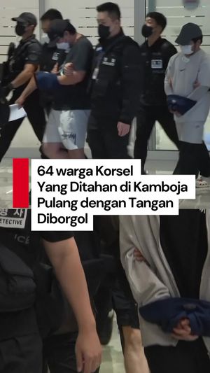 Sebanyak 64 warga negara Korea Selatan yang ditahan di Kamboja atas dugaan operasi penipuan online tiba di Korsel pada Sabtu (18 Oktober). Para tahanan tersebut tiba di Bandara Internasional Incheon dengan pesawat carteran.