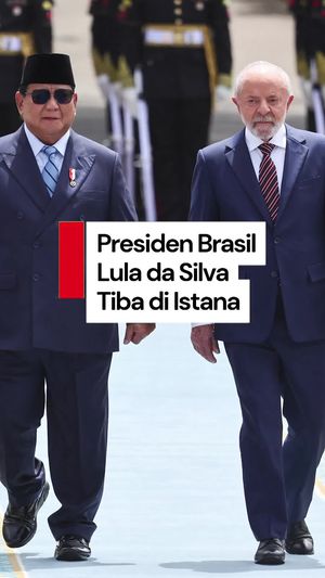 Presiden Prabowo Subianto menerima kunjungan Presiden Brasil Lula da Silva di Istana Negara, Kamis (23/10). Lula tiba di Istana diiringi pasukan berkuda dari kawasan Monas. Setelah itu, dilanjutkan upacara penyambutan, pemeriksaan pasukan, dan pertemuan tatap muka antar kepala negara.