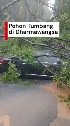 Pohon besar tumbang menimpa dua mobil di Jalan Dharmawangsa, Jakarta Selatan, Kamis (30/10). Peristiwa terjadi saat hujan deras disertai angin kencang melanda kawasan tersebut.