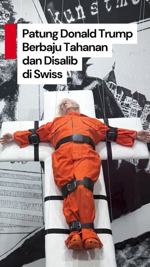 Patung Donald Trump yang mengenakan baju tahanan sambil disalib akhirnya dipamerkan di Basler Kunstmeile, Swiss. Patung ini merupakan karya seniman Inggris Mason Storm dan bertajuk 'Saint or Sinner'.
