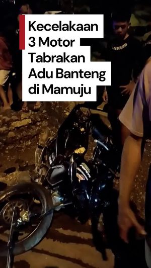 Tiga sepeda motor terlibat tabrakan adu banteng di Jalan Husni Thamrin, Kabupaten Mamuju, Sulawesi Barat, pada Kamis (8/1) malam. Kecelakaan ini mengakibatkan 2 orang tewas dan 3 lainnya luka-luka.