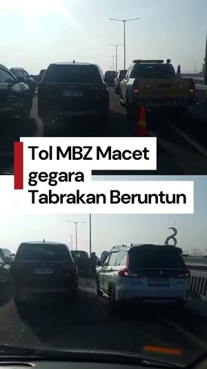 Tabrakan beruntun di Tol Layang Mohammed bin Zayed (MBZ) membuat lalu lintas arah Cikampek padat merayap. Jasa Marga pun mengimbau pengendara menggunakan lajur kiri.